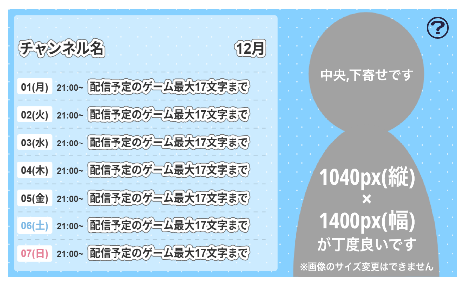 特徴: 縦型と横型、週間と月間のテンプレートが用意されており、用途に応じて使い分けが可能です。背景色や文字色の調整に加え、日付の表示・非表示も選択できるため、配信頻度やスタイルに合わせた柔軟なスケジュール表が作成できます。